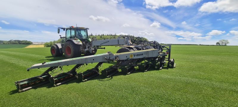 We mow our turf with 2 Kesmac 11 gang mowers, each of which is 25 ft wide. We also use a 20 ft wide Trimax rotary roller mower and the collect the cuttings with 2 huge Trilo grass vacuum's.